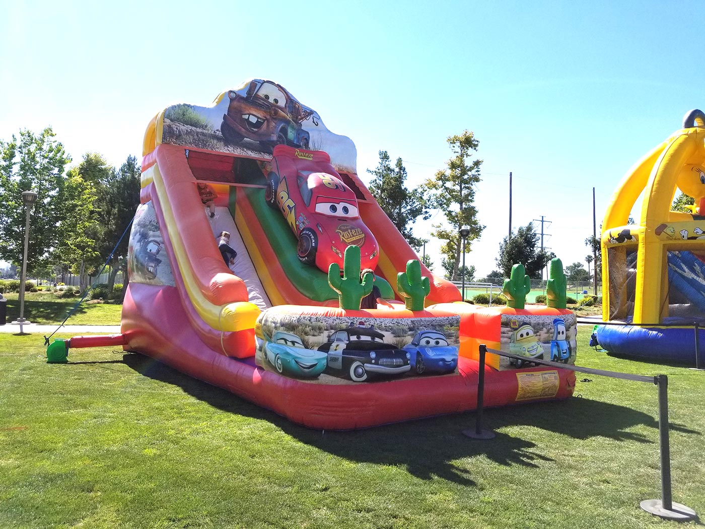 Kids can climb up the center tunnel, which is topped off by a 3D Lightening McQueen, and then choose from either a right vs left-sided slide for a speedy ride to the cushioned bottom. Mater, the fun-loving truck sits atop the dual-lane slide, while guests from Radiator Springs fill the bottom art panels, and 3D cacti flank the end of each racing-inspired dry slide. Part of an exciting line of licensed Cars inflatables from Ninja Jump, this Cars Double Lane slide is sure to please everyone at your next event.