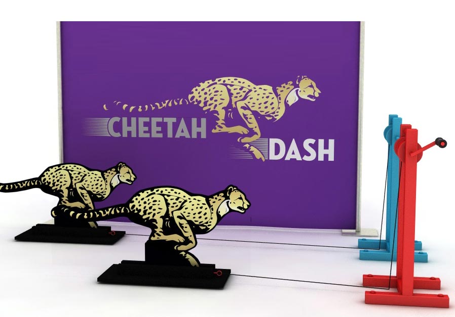 Our custom designed cheetah race is a fun, truly interactive game. You control the cheetah’s with six other contestants. The 30′ x 12′ football field makes for a very fun, exciting, and fast paced race.