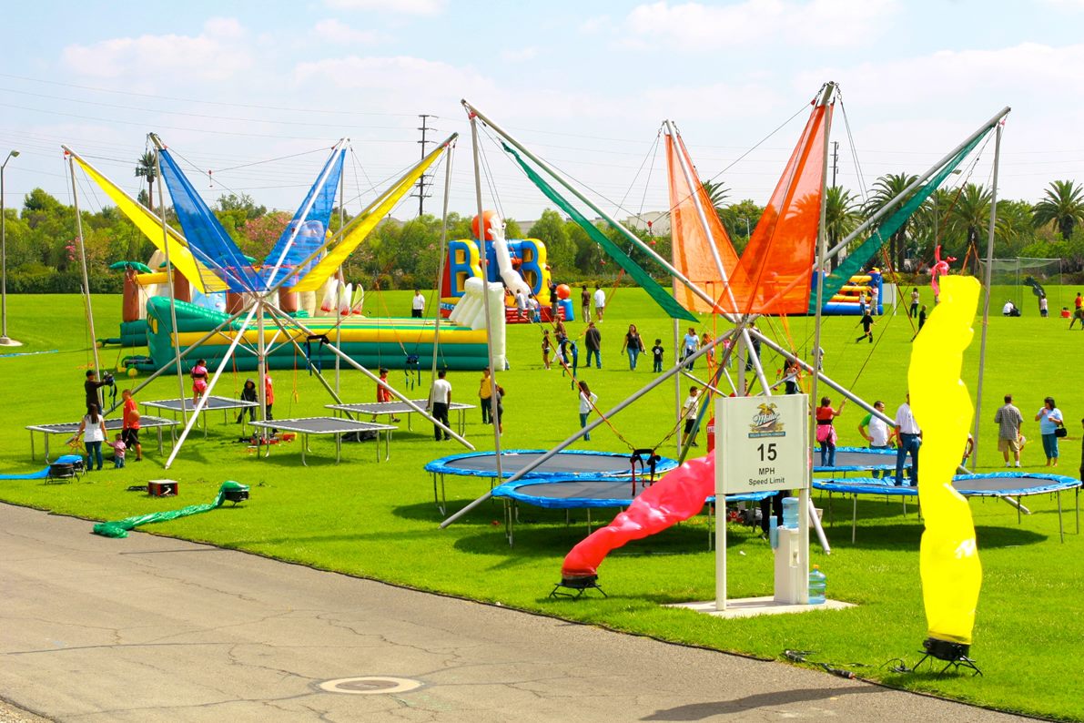 Bungee sporting takes a whole new direction with this brand new system…straight up! Your guests are fitted at the waist with bungee cords, which are used to suspend them from above, enabling them to flip, spin, and jump to amazing altitudes! This ultimate bungee station handles four jumpers at one time. *Four people every two minutes. 40′ long x 40′ wide x 33′ high. 220 amps.