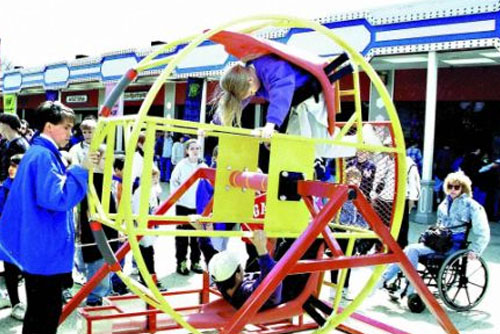 Your guests can feel what it’s like to be human hamsters as they get strapped two at a time into a giant hamster wheel.