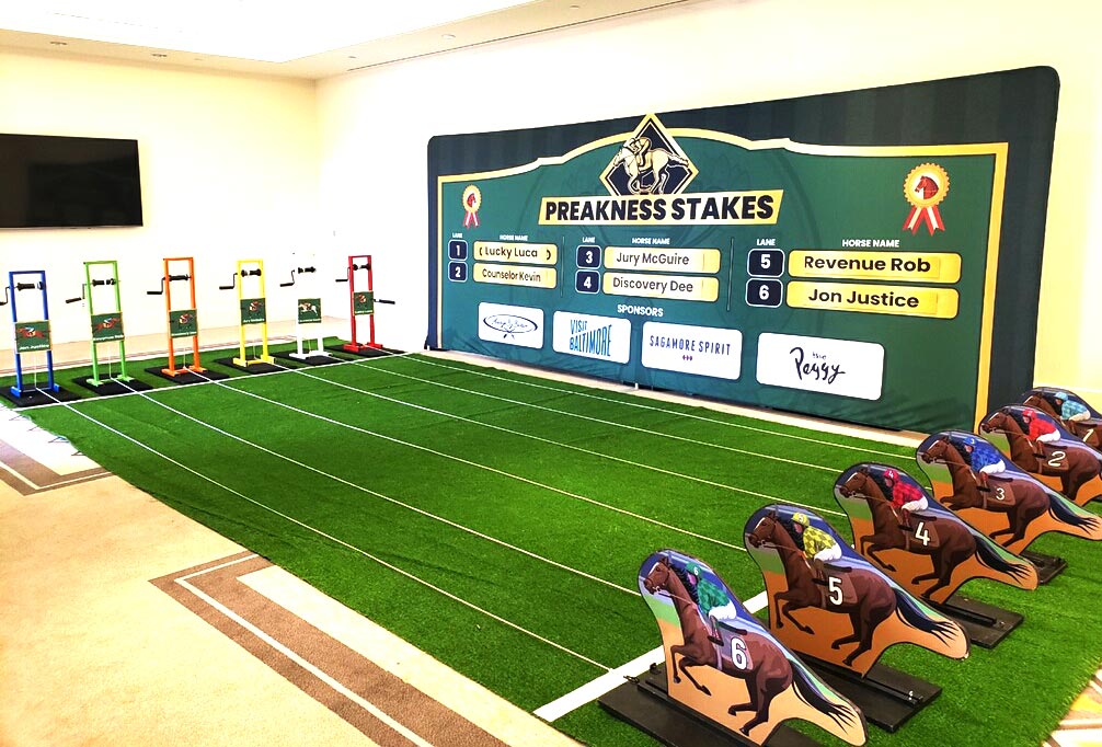 Our custom design for a day at the races, makes this game truly interactive. You become the jockey with six other contestants. The 30′ x 12′ green race track makes this for a very fun, exciting and fast paste race. The horses can be sponsored as well as the jockey. This game comes complete … even with betting forms.