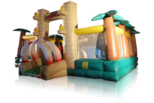 Enter through the ancient dinosaur boneyard, then use ropes to guide your feet up the rocky terrain of the raging volcano at the mountain’s peak. If you can’t take the heat, take the fastest route to the bottom via the 10-foot dueling inflatable slides. Then, ride the two rockin’ dinos and slam the tall dinosaur pop-up heads. It’s an adventure that you’ll never forget! Dimensions: 24′ L x 29′ W x 15′ H.