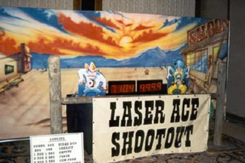 This is a two player game. If needed, we can add more to the drawing table. The object is to draw when told against your partner. A series of eight targets randomly light up. The first one to hit the target scores the point. The winner is determined at the end of the game when all is added up via an internal computer. This event can be themed out for western, futuristic, or city slicker events. Or, it can be easily customized to fit your gunfight theme. Guns are highly accurate!