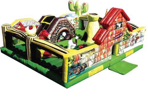 This educational inflatable structure is designed to educate and entertain toddlers in an adorable farm setting. This game offers a small climb and slide and several 3-D animals and structures such as a dog, horse, chickens, hay stock and a cactus.