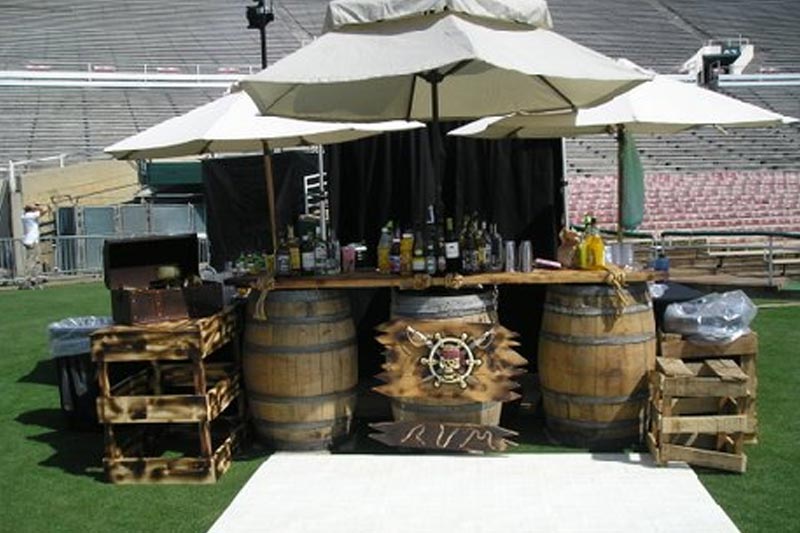 Our pirate bar utilizes barrels, planks, and oceanic props.