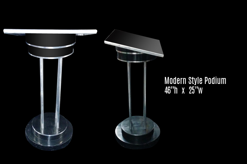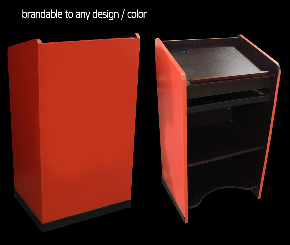Multiple sizes and types of podiums. Most of these can be custom branded with logos on the front.