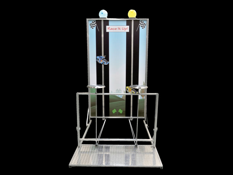 Crowd-pleasing fun for the entire family. Race to the Top plays big, yet packs small. It’s the perfect game for all ages. Players go head-to-head, spinning their wheel to advance their figure up the field. The first one to reach the top (and pop the balloon) wins. High throughput — each game lasts approximately 60 seconds. No operator training needed. Use multiple units side-by-side for added competition. Use one of our pre-made backgrounds (e.g., auto race track or horse race track) and figures (e.g., hot rods, horses, skateboarder) or create your own* Each unit folds flat for easy transport, protection, and storage. Off-the-shelf field-replaceable parts guarantee minimal downtime, if any.