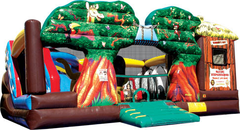 play center takes participants on a full-scale safari experience, all in one central play structure. Imaginations can go “wild” as kids can choose to ride in a camouflage, all-terrain vehicle, or run under a tunnel of elephant tusks. Spend time with an African lion, running under his mesh-tunnel belly, or playing tag under trees with friendly giraffes. Always a crowd favorite, this Safari Experience house meets everyone’s love of adventure with it’s own rainbow slide and contains plenty of jumping room