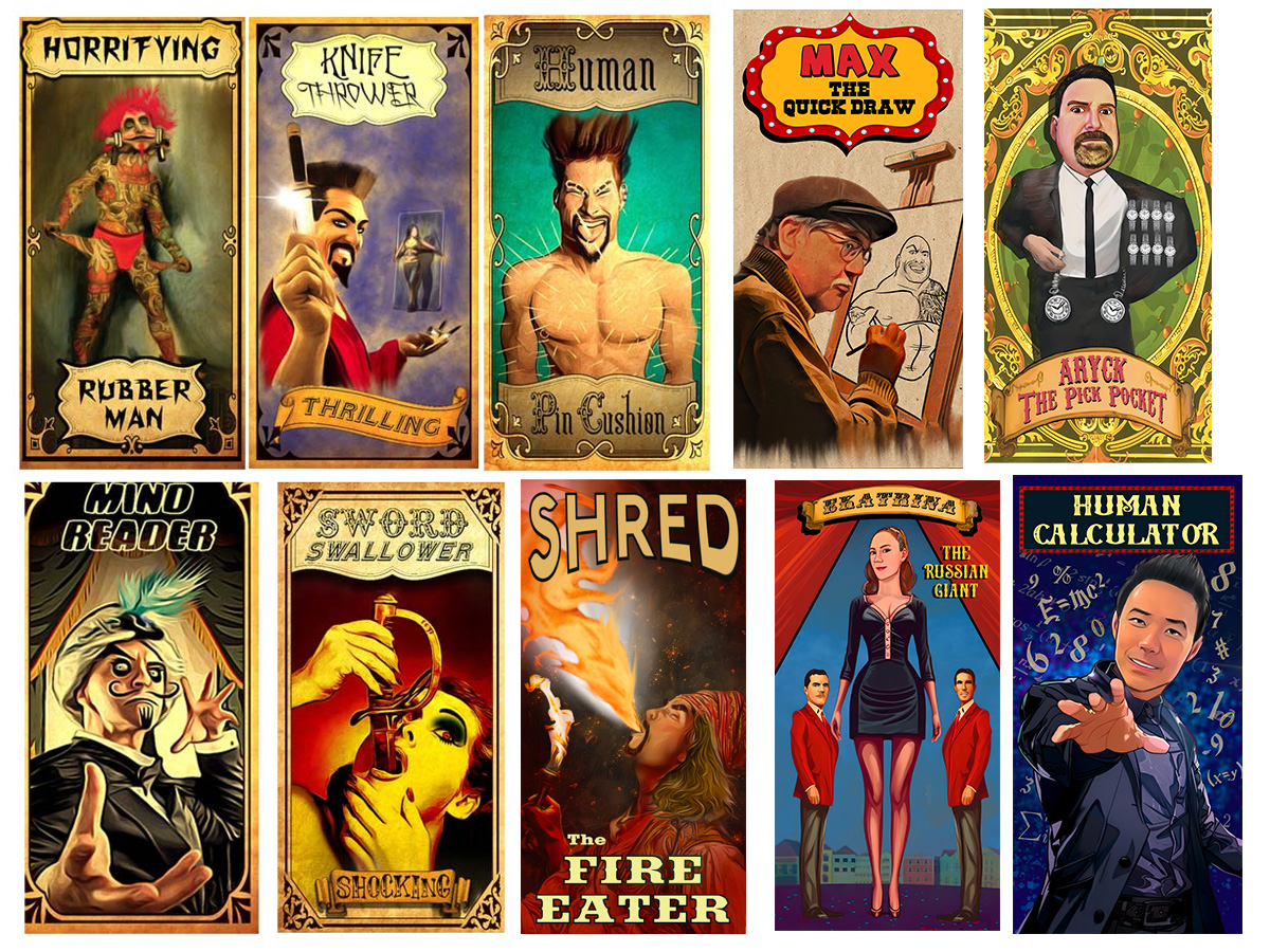 STRONG MAN SNAKE LADY FIRE EATER MAGICIAN JUGGLER and we can even make them custom. Each banner is 4′ by 8′ tall. All these have been designed in house and we own all rights to use these for all media.