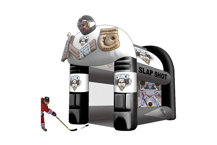 Slap Shot is equipped with a radar gun to calculate the speed of your shot. This custom inflatable is created with accentuated visuals. The back drop can also have “targets.”