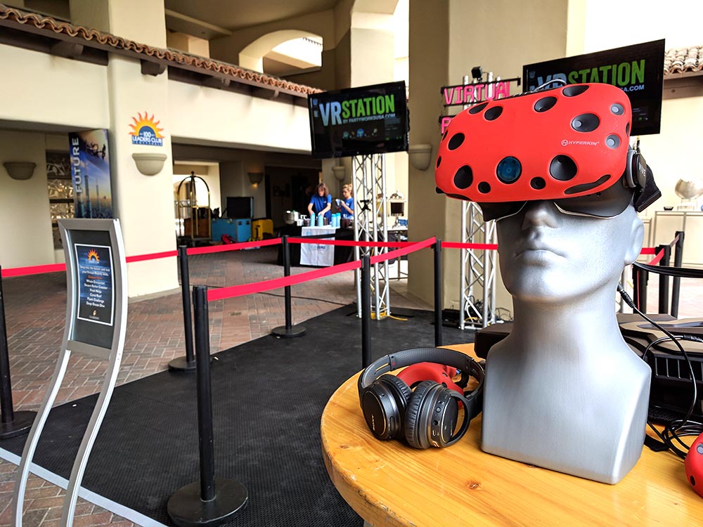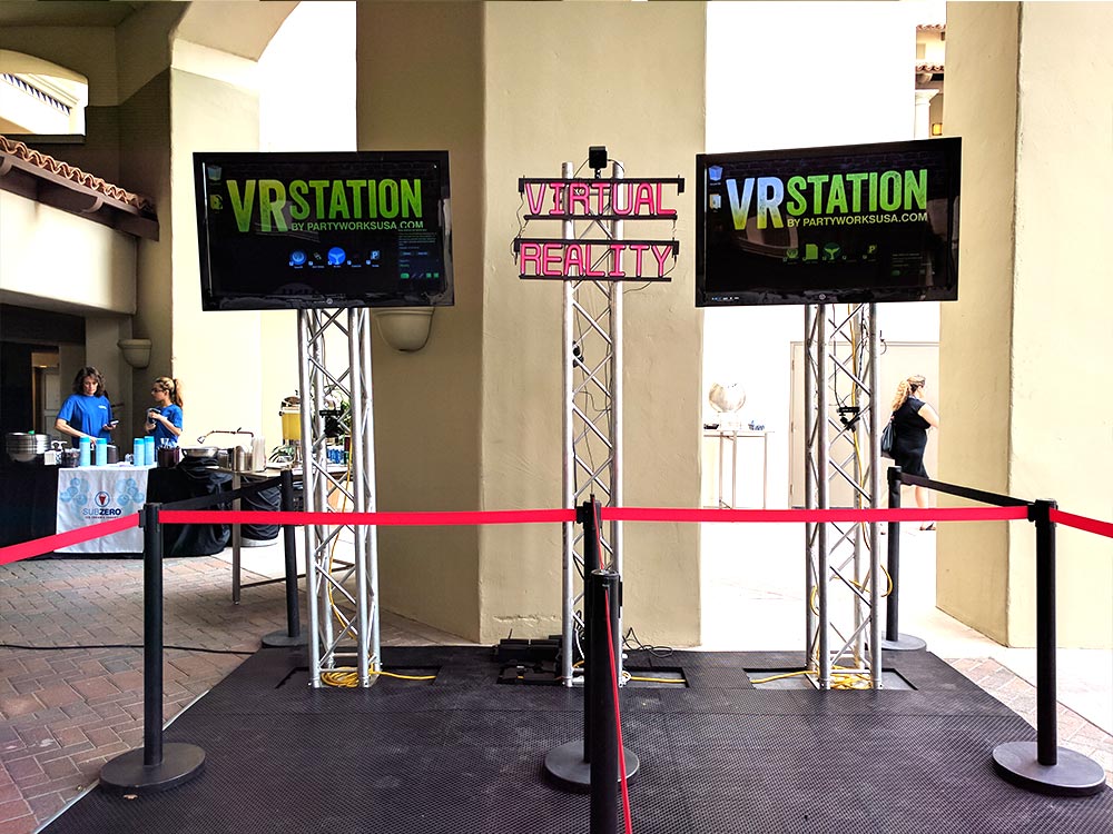 Our custom truss setting allows for private setting, branding, and great visual stage with TV mirroring what the current user is seeing on his VR headset! Wireless setup to eliminate tripping .