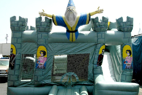 This is a combination inflatable. This enclosed bounce has two points of entrance and exit. Equipment with a built in slide and pop ups makes this a very fun zone for your guests.