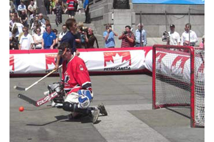 This is the ultimate in hockey action. This live goalie stands in front of a hockey net and blocks all the shots that come in his range! (Well, almost every shot)